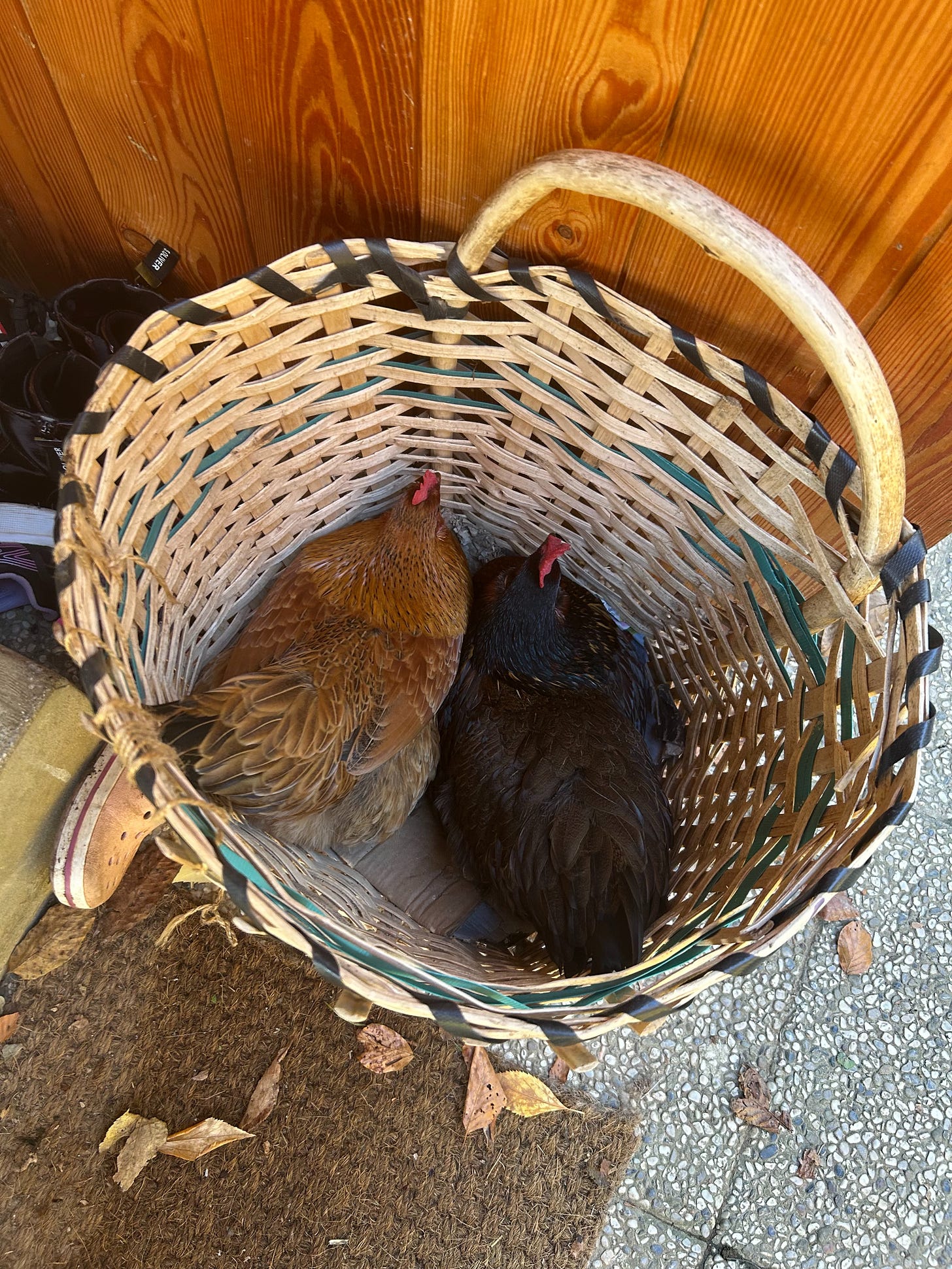 Ok, so chick meltdowns aside, we raised them in our basement (turned the big airplane dog crate into a makeshift brooder), found new homes for, and harvested the 4/9 roosters we ended up with (life is not fair for a rooster — we actually tried to keep one but he became so aggressive, especially toward my youngest and our dog that we decided it was too risky so he went to a neighbor), built a coop out of materials we already had (except for the wire mesh), ordered 5 more chickens from a Slovenian chicken farm, successfully introduced them, and now we’re finally collecting eggs daily, though not always (or ever) in their beautiful nesting boxes. In fact, the preferred nesting place, seems to be the basket we use to haul firewood, right by the front door. We’ve been catching two birds trying to lay their eggs at the same time in that basket, and it’s quite the soap opera.